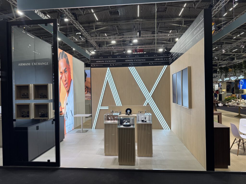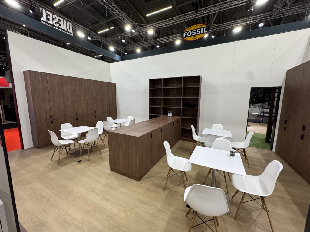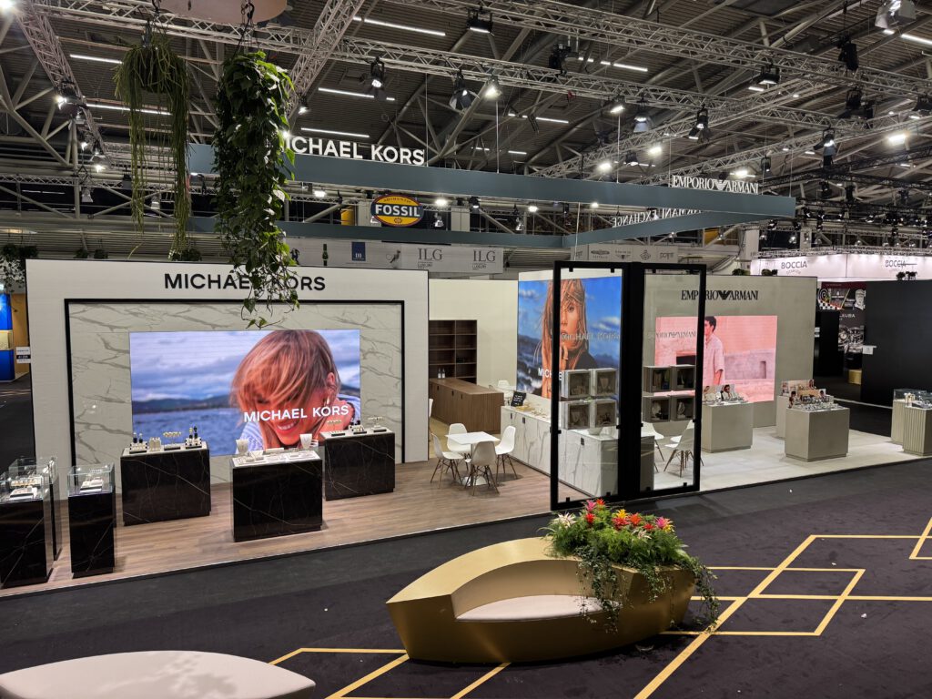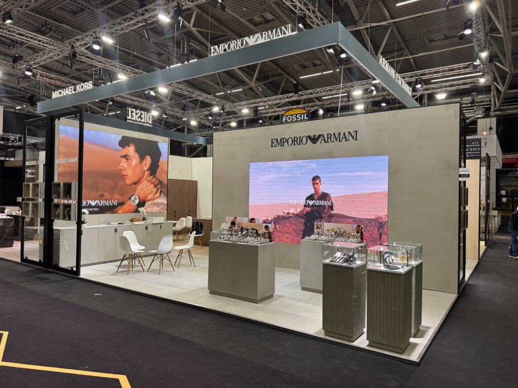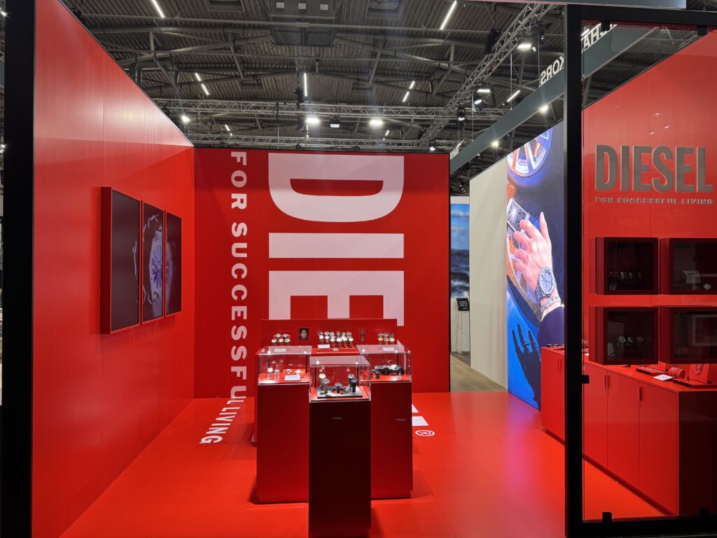 Auf dem Messestand präsentierten sich vier weitere Marken, jeweils mit einem eigenen, klar abgegrenzten Bereich. Die Gestaltung orientierte sich dabei direkt an den jeweiligen Shop-Konzepten: Bei Diesel kamen rote Hochglanzflächen zum Einsatz, Michael Kors erhielt tapezierte Wände, Armani überzeugte durch eine Betonoptik, und Fossil setzte auf warme Walnussoberflächen.